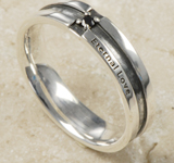 | センターにルビーカラーのキュービックジルコニアをセット。石の周りにはセインツのコンセプトにある4つのキーワードの言葉が刻印 |