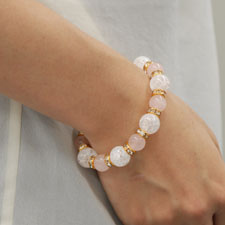 ローズクォーツ、ロック水晶、金白ロンデルパーツを融合したデザイン性を重視したメンズパワーストーンブレスレットです。温かみのある可憐に女性の手首を美しく魅せるファッションセンス抜群の本物志向のあなただけのオンリーワンスタイルです。ローズクォーツは華やかさと優しさを醸し出してくれる優しい輝きです☆